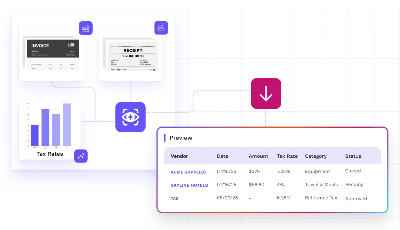 Turn invoices, receipts, bank statements, and SEC filings into clean, tabular data instantly. Process hundreds of PDFs, images, and charts at once, and feed structured results directly into reconciliations, reporting, or close workflows.